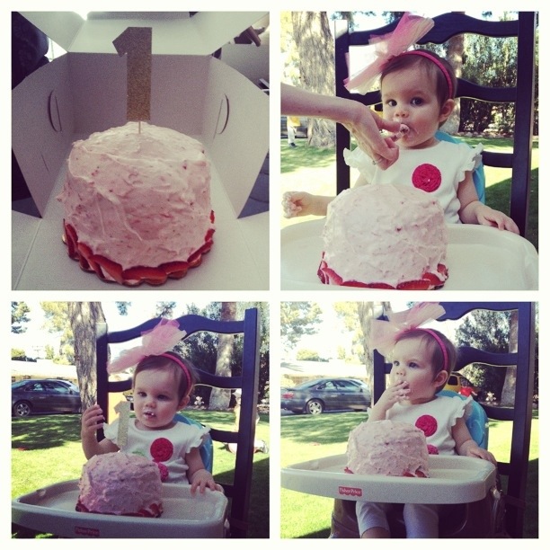 Smash cakes seem to be the new thing for a youngster’s birthday, a small round cake that the kid can dive into and get messy with.  I had a request this past weekend to bake a smash cake and cupcakes for my favorite 1 year old’s birthday. I went with a classic vanilla cake with fresh strawberry icing, recipe below.