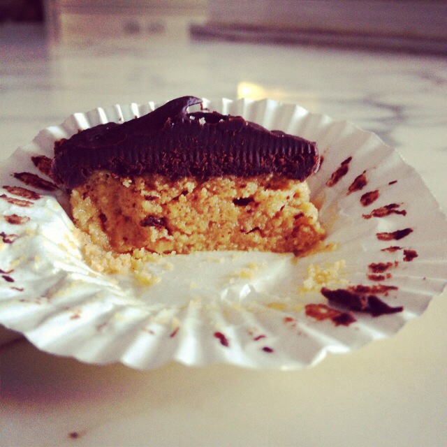 3. Distribute mixture evenly between prepared muffin cups (using an ice cream scoop helps this process). Tap muffin pan on counter to help settle the mixture in the tins. Freeze for 5 minutes to set peanut butter layer.