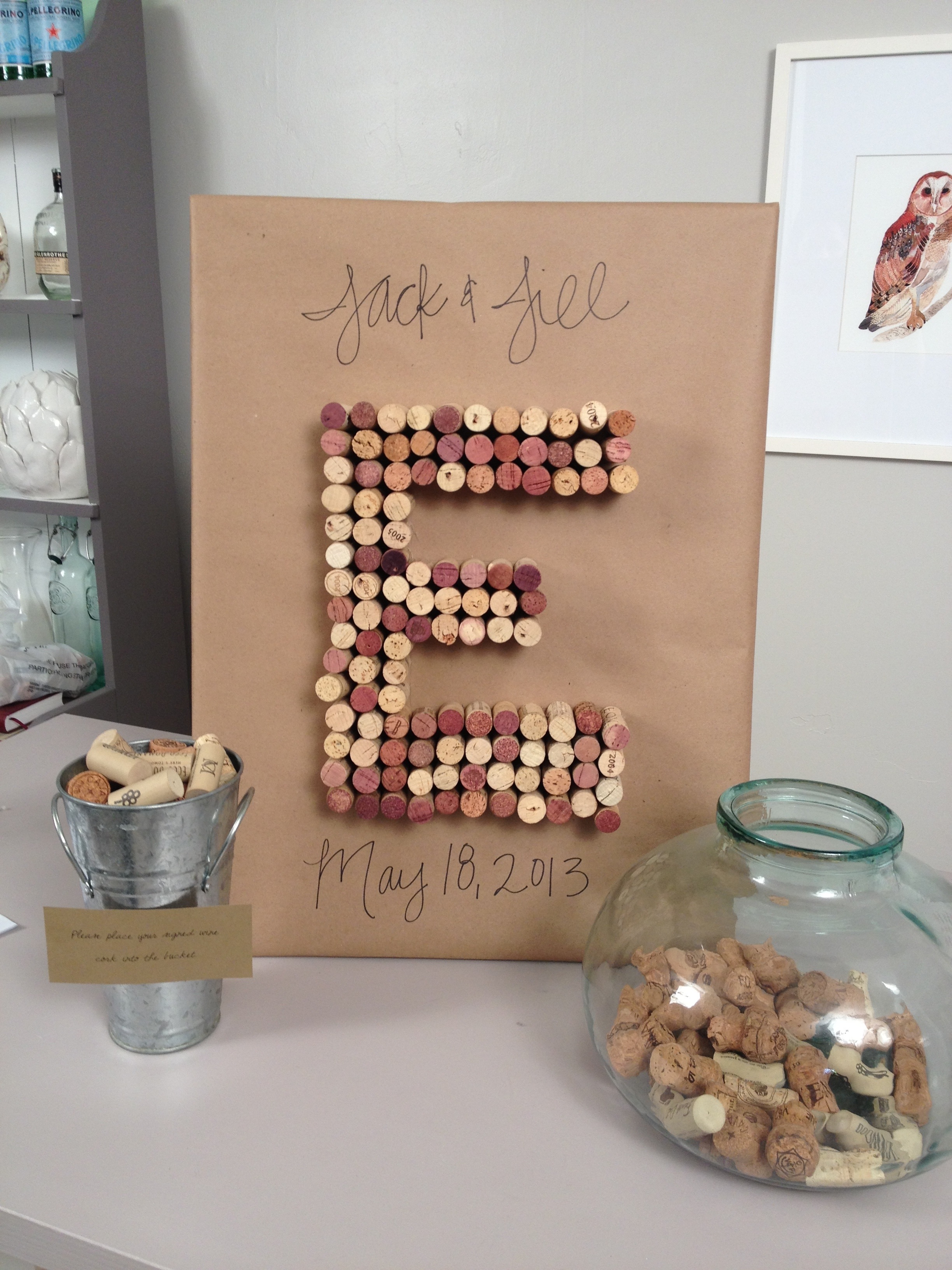 If the bride and groom are wine lovers or the wedding is taking place at a vineyard, have the guests sign wine corks. I wrapped a canvas in kraft paper and then hot glued wine corks into the first letter of the bride & groom’s last name or make free standing letters. Either way it’s a great decorative accent to the home.