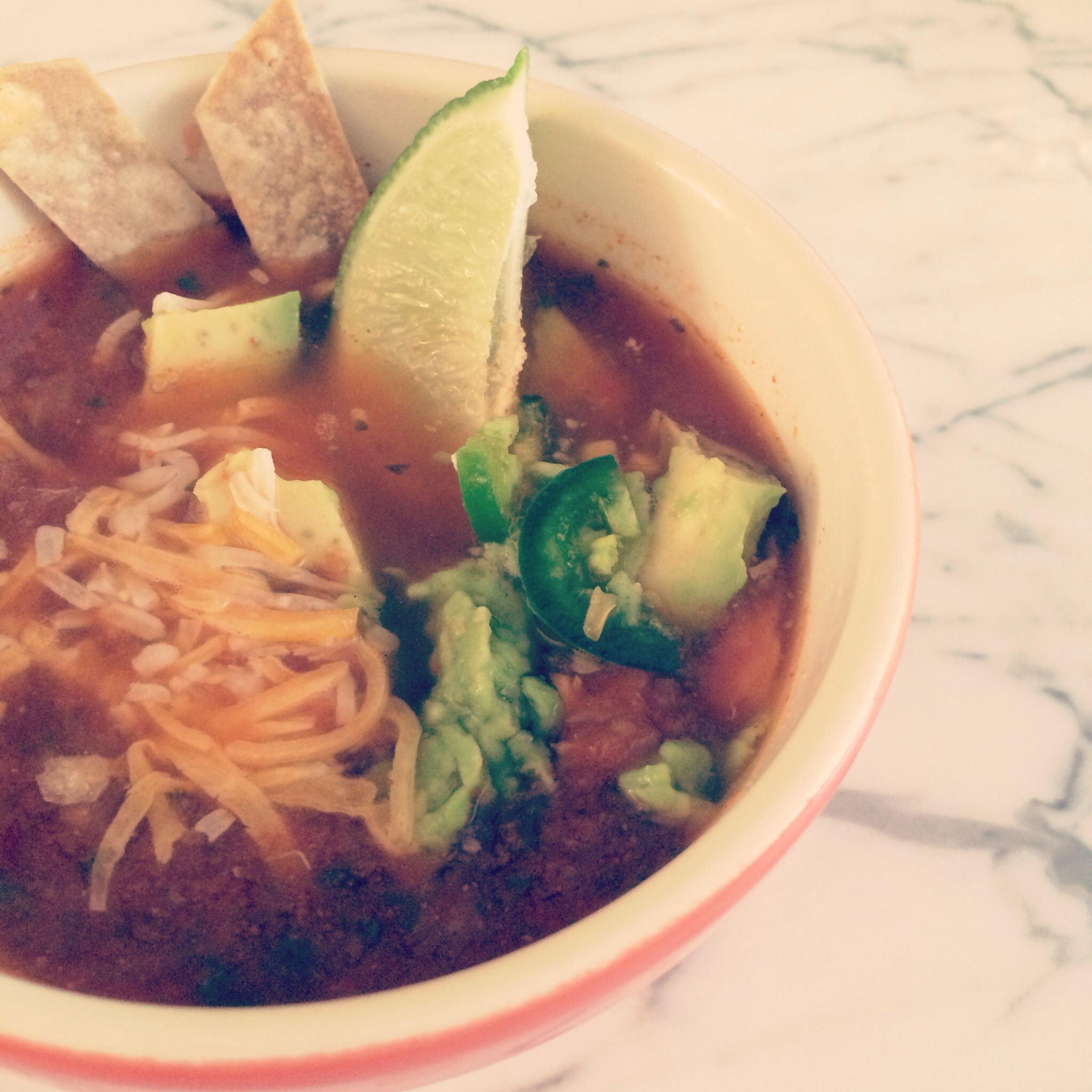 To serve, ladle the soup into bowl and top with a squeeze of fresh lime juice, avocado chunks, jalapeño slices, tortilla strips and shredded cheese.