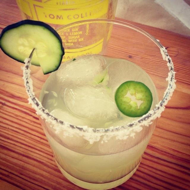- Prep glass by rimming it with a lime wedge and dipping into salt.